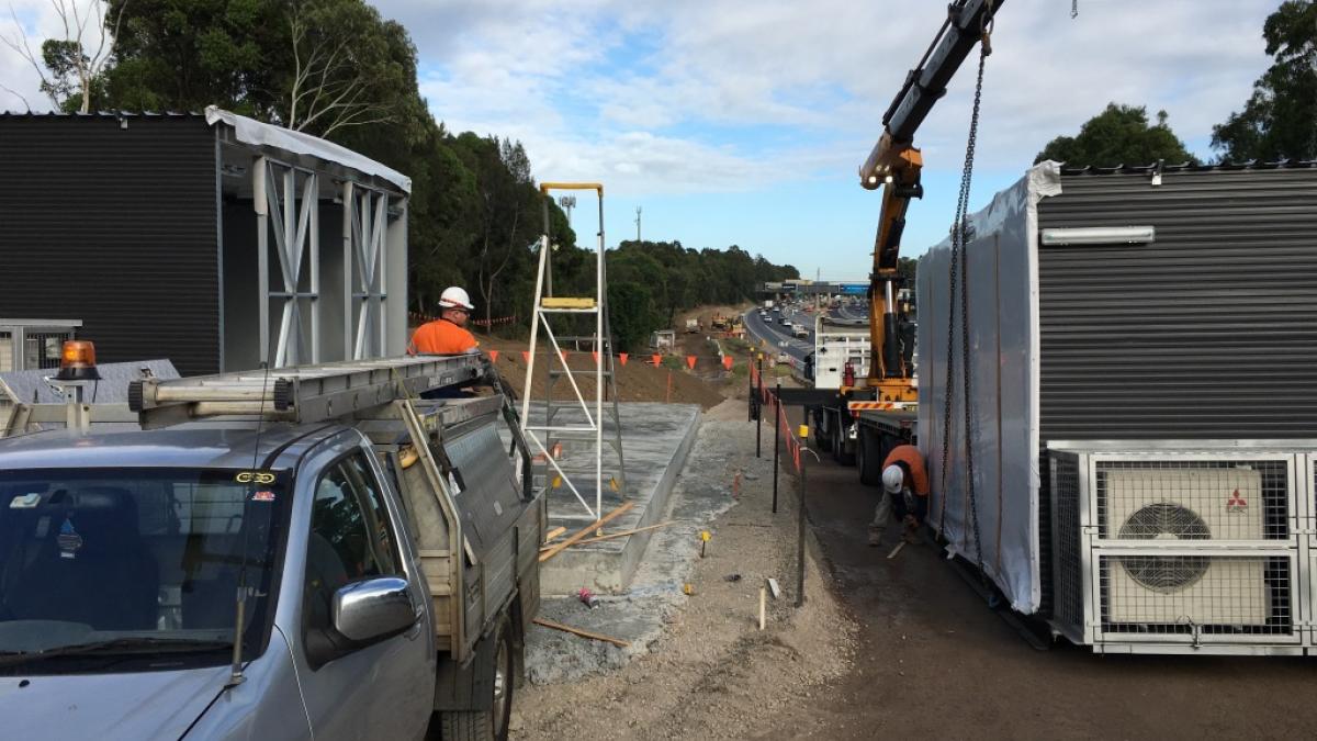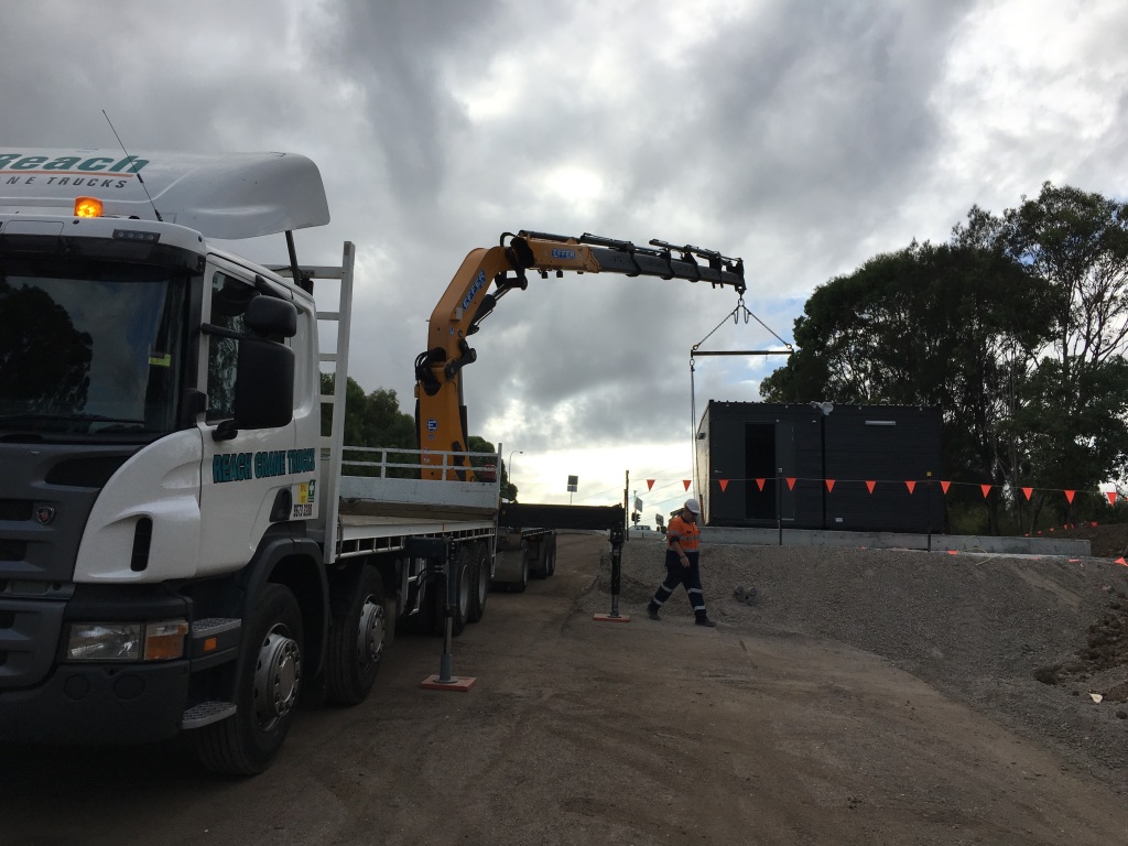 RCT spent many days and nights as part of the M4 Widening project. Part of the project was delivering and installing the substations and toll sites. In the photos attached is truck 05 (Scania with Effer 470) installing the switch rooms for the toll gantries.
