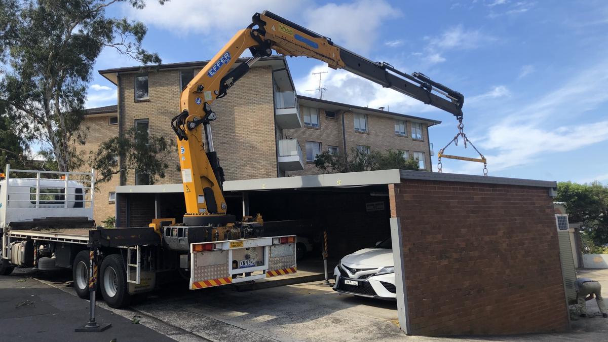 Truck 92 was called upon earlier this month to deliver a portable building down an alley way and over the garage. This Effer 315 has 14m reach with front and back legs for stability.