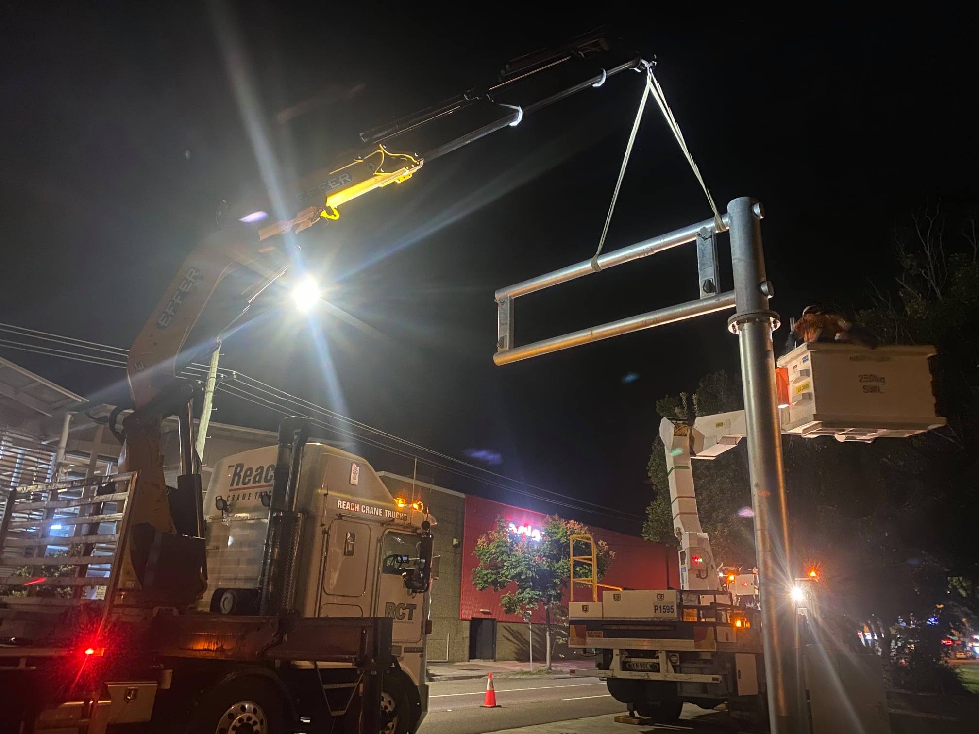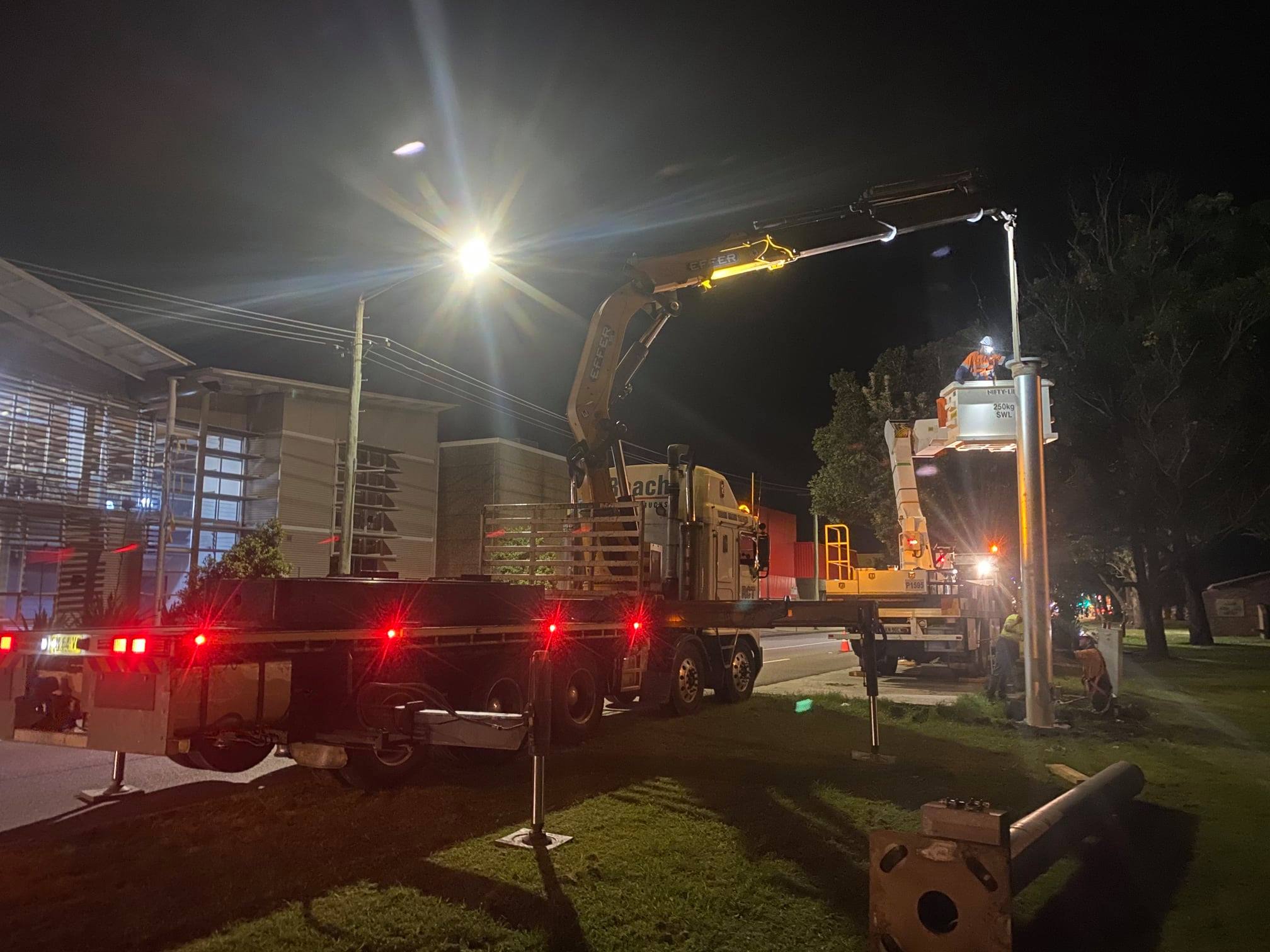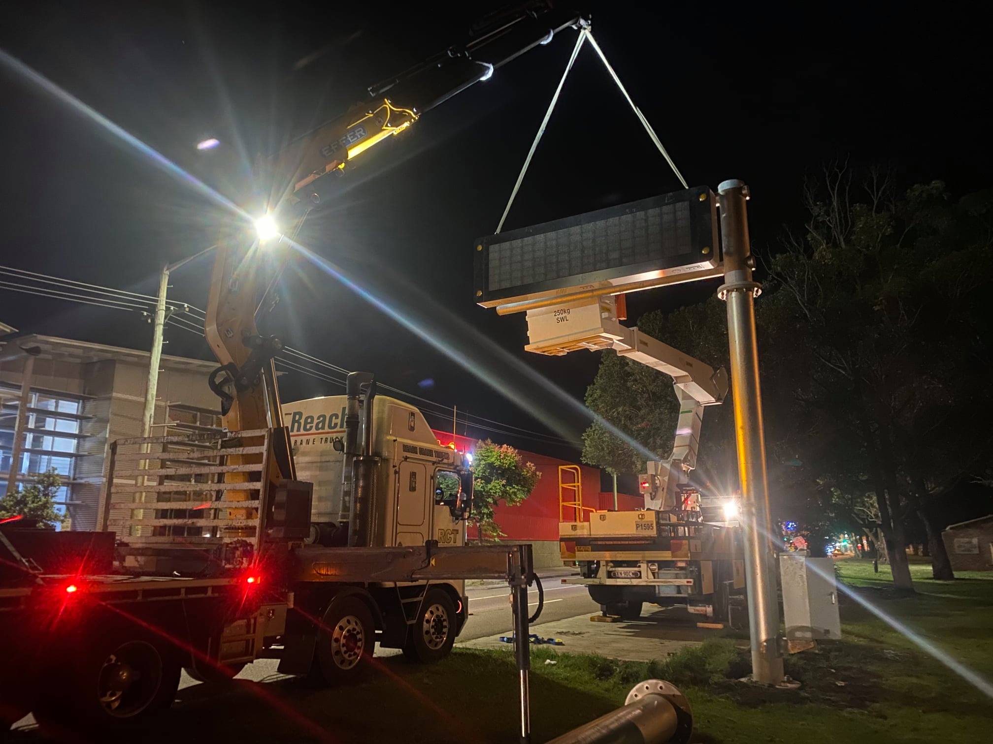 As winter nears, the nights get chillier! Our Kenworth 10-Wheeler was tasked last week with replacing an old VMS board with a new one at Swansea. The Effer 505 crane fitted to this truck had a field day with this install; this crane can lift 2120 kgs @ 16.85m